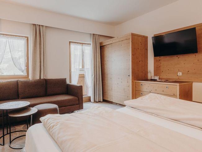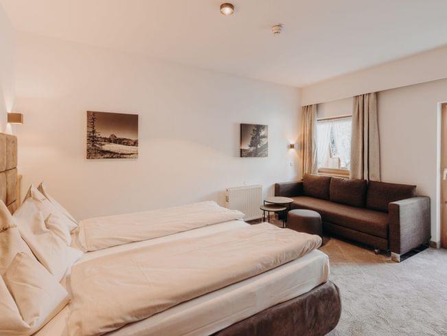 - 40 Familienzimmer und -suiten (24 im Haupthaus und 16 im Bauernhaus-Chalet) mit Balkon und traumhaften Ausblicken