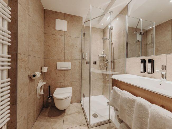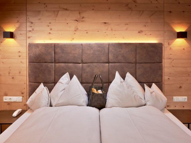 - 40 Familienzimmer und -suiten (24 im Haupthaus und 16 im Bauernhaus-Chalet) mit Balkon und traumhaften Ausblicken